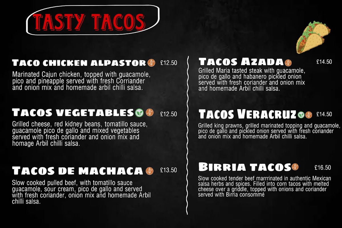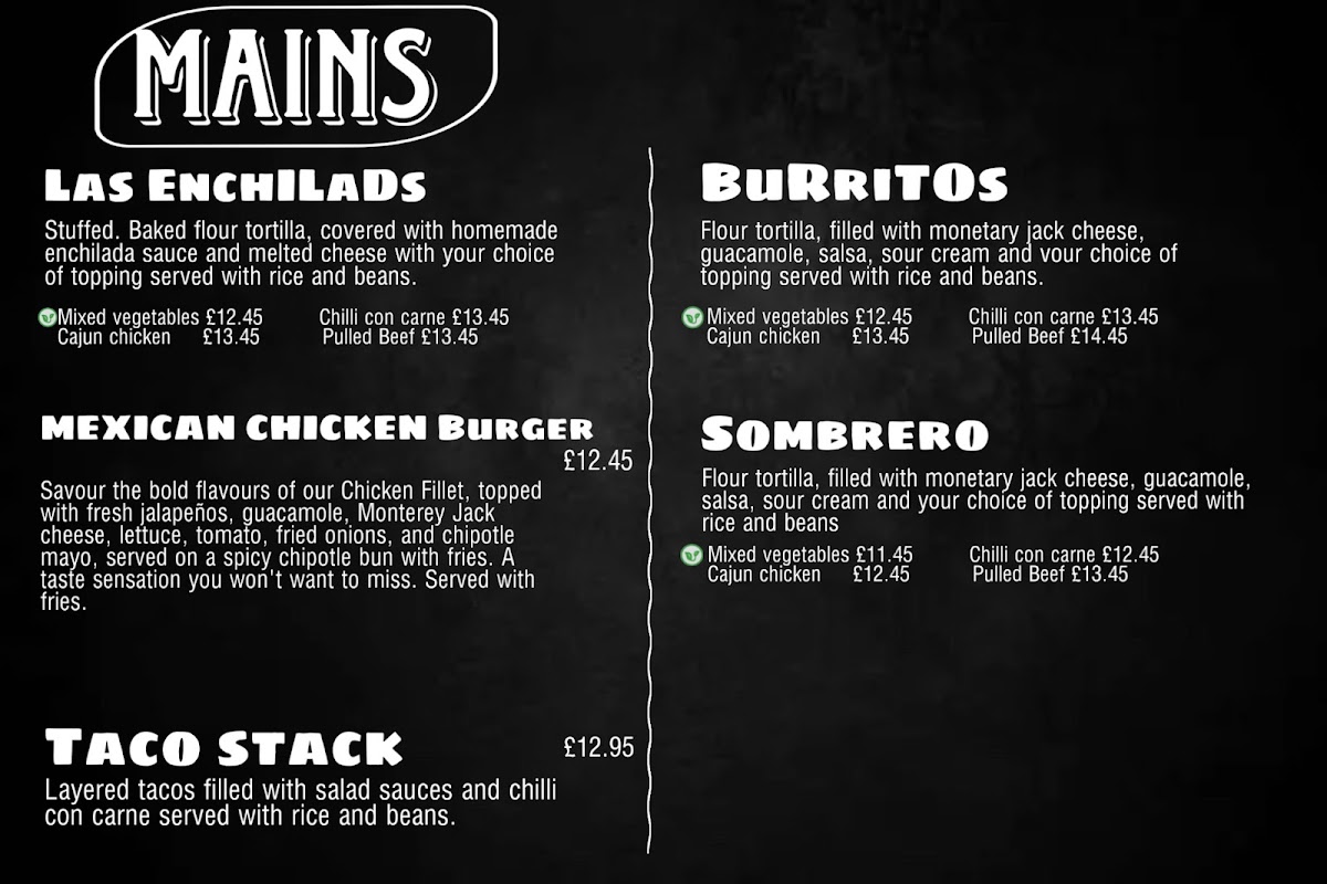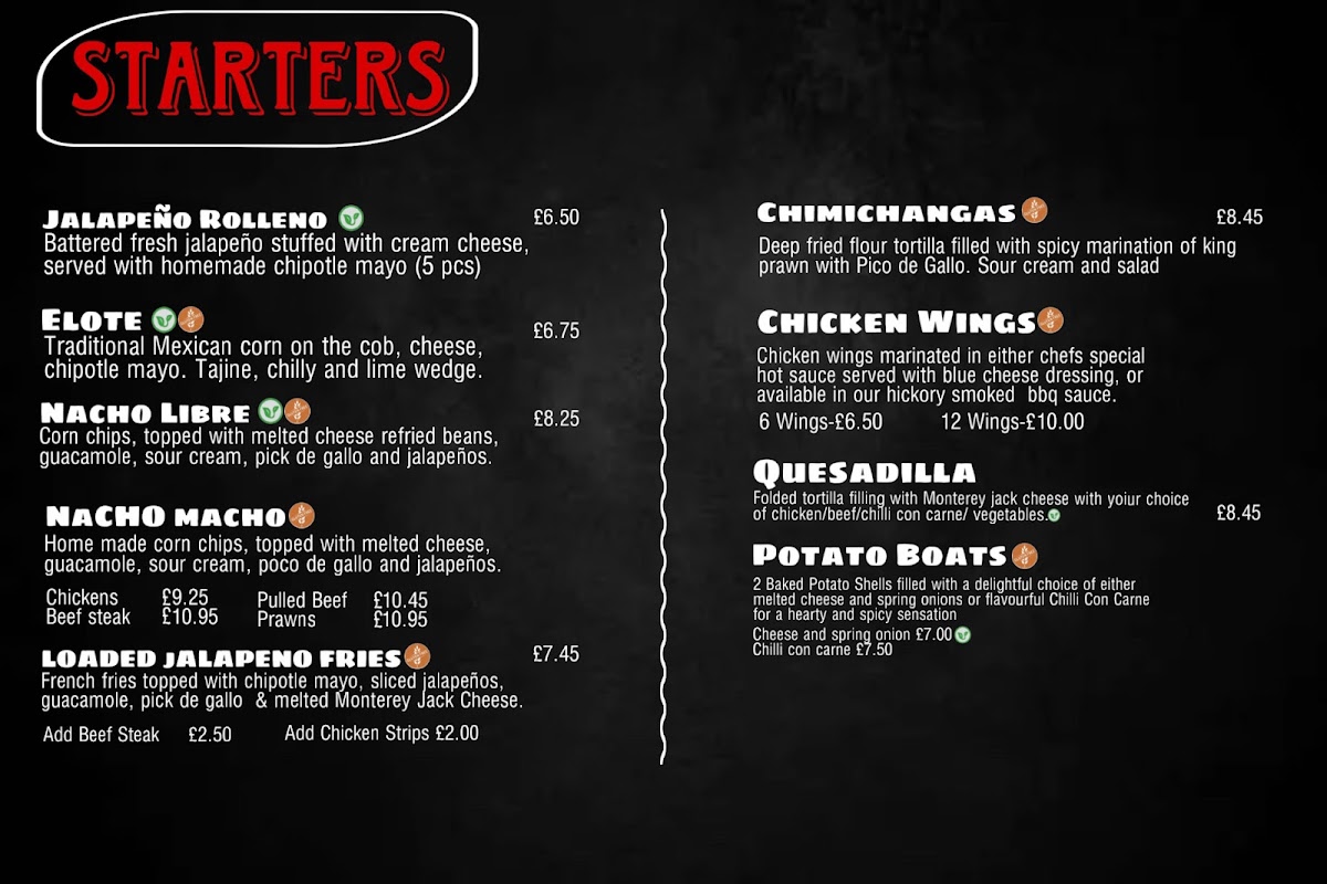 The menu at The Mexicanos is a vibrant celebration of bold Mexican flavors, offering an exciting array of dishes across various categories. Starting with the Starters, guests can enjoy spicy and flavorful options like Jalapeno Rolleno and Loaded Jalapeno Fries, or go for the crispy Elote Chicken Wings and indulgent Macho Nachos. Each starter brings its own twist on traditional Mexican ingredients, with the Jalapeno Rolleno offering a stuffed kick and the Loaded Jalapeno Fries adding a cheesy, zesty touch to the crispy fries.