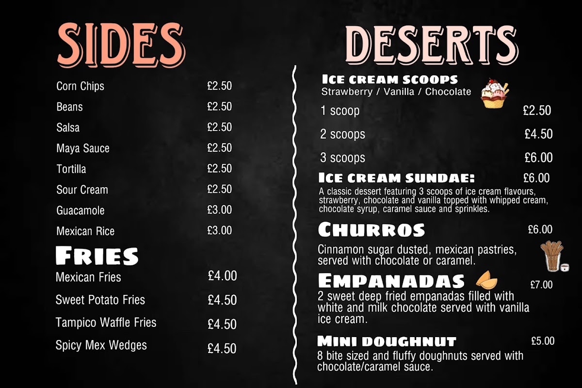 Side dishes like Cajun Fries, Sweet Potato Fries, and Mexican Wedges complement the meal perfectly, while the Corn Chips, Beans, Pico De Gallo, and Chipotle Mayo add authentic Mexican flavors to every bite.
